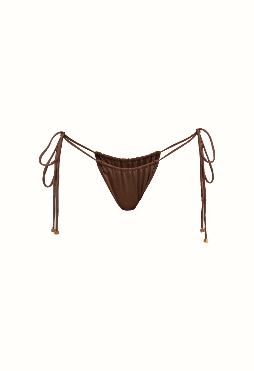 A calcinha Lynne apresenta um corte cavado e sexy, com laterais ajustáveis por amarração que permitem um ajuste perfeito ao corpo. Seu design minimalista valoriza as curvas, além de deixar a pele exposta para um bronzeado perfeito. O vies fino com ponteiras douradas garantem delicadeza e sofisticação à peça.